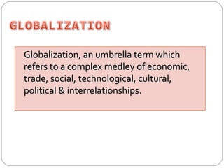 Globalization refers to a complex mix of economic, trade, social, technological, cultural, political and interpersonal relationships. It is defined as a process that is changing the nature of human interaction across a wide range of spheres, including economic, political, social, technological and environmental. Some aspects of globalization include industrial, financial, political, informational and cultural globalization. Globalization can have both positive and negative effects on health issues and cultural assimilation.