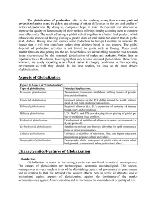 Globalization is occurring across multiple dimensions including economic, cultural, political and financial spheres. Key aspects of globalization include the merging of national markets into a global marketplace, the dispersal of production activities across countries, and the increasing flow of ideas, culture and information enabled by advances in technology. Both opportunities and challenges arise from globalization, such as more competitive prices for consumers but also potential job losses and increased cultural homogenization.
