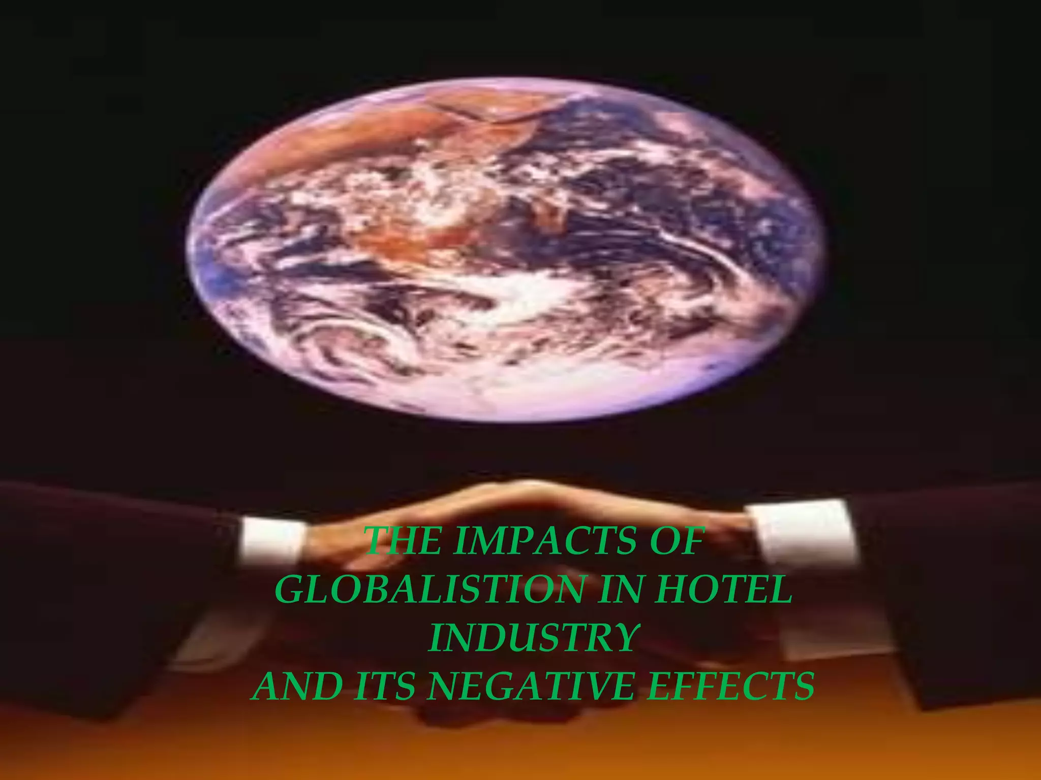 Globalization is having both positive and negative impacts on the hotel industry. Positively, it increases the customer base, boosts economies, and promotes cultural exchange. However, it also introduces challenges like language barriers, cultural differences, and seasonal employment. As the hotel industry globalizes, companies must adapt organizational cultures, management styles, structures, and training to diverse international markets and customers. While globalization opens opportunities, hotels must mitigate risks from events in other countries and changing technologies.