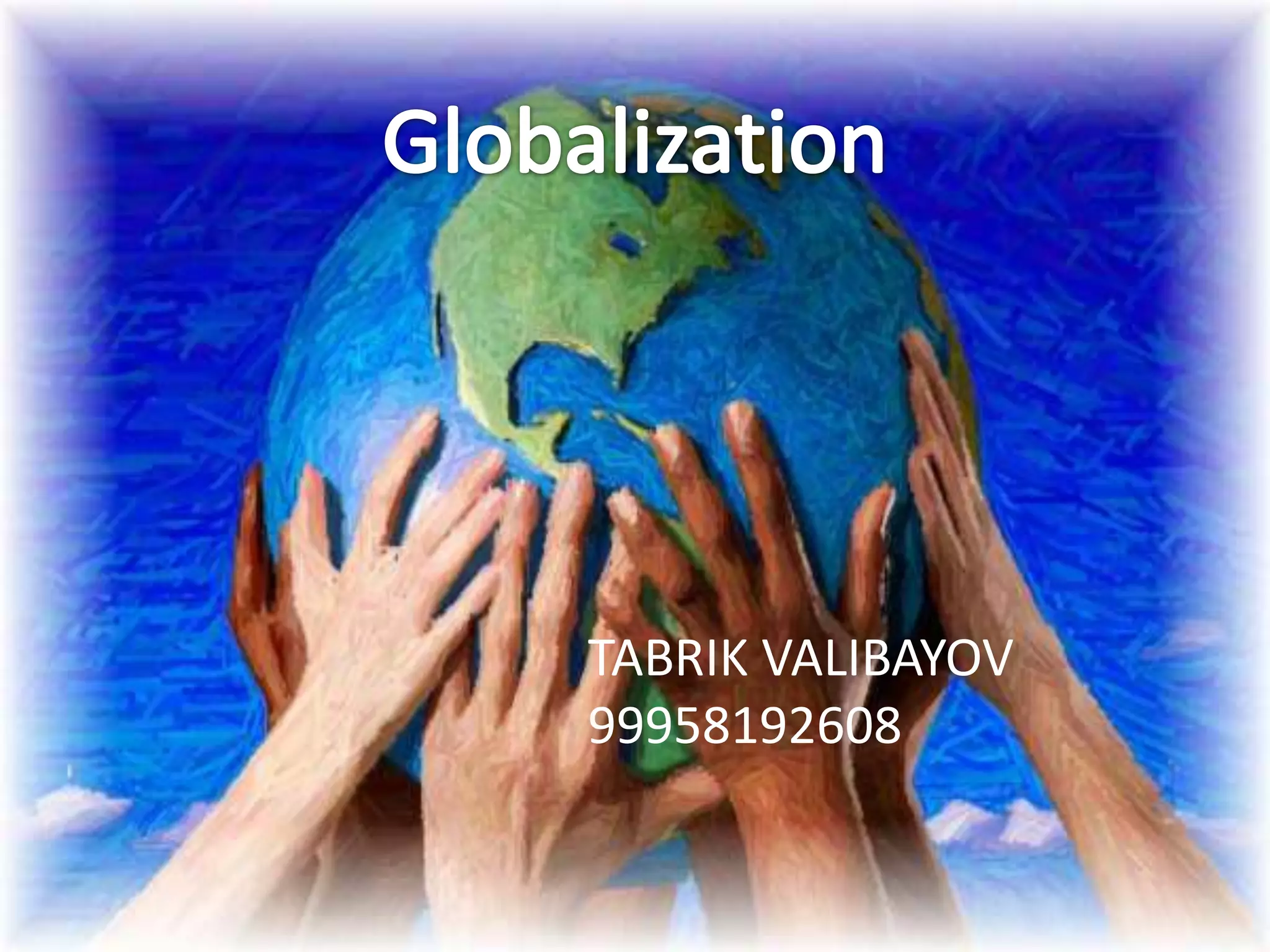 Globalization can be defined as the increasing interaction and integration between governments of different nations. It has led to rising international trade and foreign direct investment. New communication technologies like the internet have facilitated e-business and allowed people to work remotely. Culturally, globalization has resulted in new global professions for highly skilled workers who speak foreign languages and travel internationally. Pop culture, especially American pop culture, has spread through movies, music and television shows. Overall, globalization is making the world feel smaller like a global village where ideas and practices can be freely exchanged.
