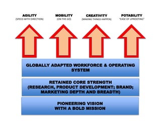 The document outlines key strategies for a company to stay ahead of global competition including having a globally adapted workforce and operating system with agility and speed, mobility to work on the go, retaining core strengths in research, product development, brand and marketing, creativity in making things happen, a pioneering vision with a bold mission, and portability to easily uproot operations.