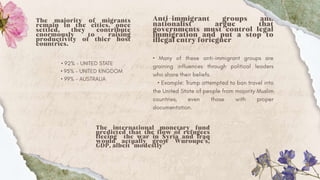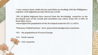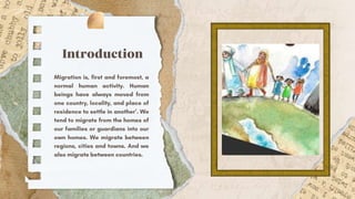 This document discusses different types of migration including internal migration within a country and international migration between countries. It identifies five groups of international migration and notes benefits and detriments of migration for sending countries, including economic gains from remittances but also human capital losses.