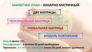 Документ представляет маркетинг-план с бинарно-матричной структурой, предлагающий три платформы: серебряную, золотую и бриллиантовую, где вход составляет 10 долларов и требуется пригласить двух партнеров в течение 30 дней для активации аккаунта. Каждая платформа имеет свои уровни и требования для перехода, а также различные способы заработка через личные и глобальные матрицы. Команда предлагает обучение и поддержку, чтобы помочь участникам эффективно развивать свой бизнес в сети.