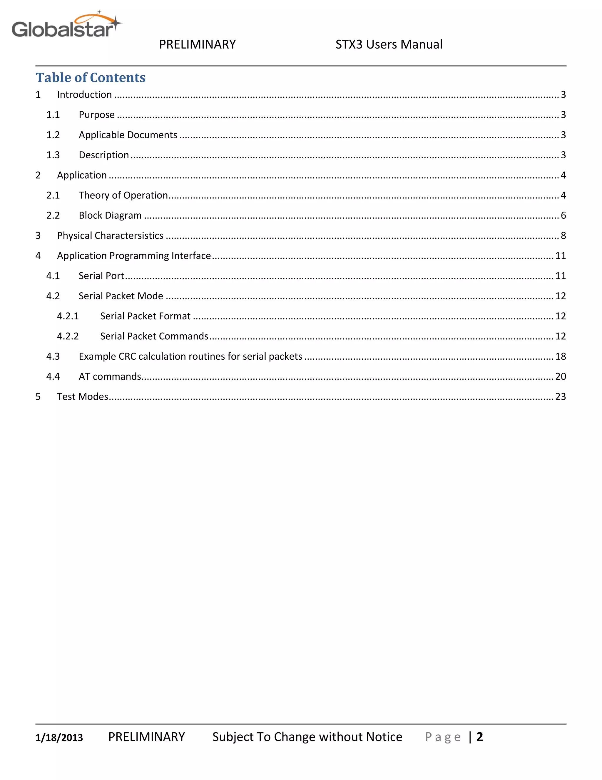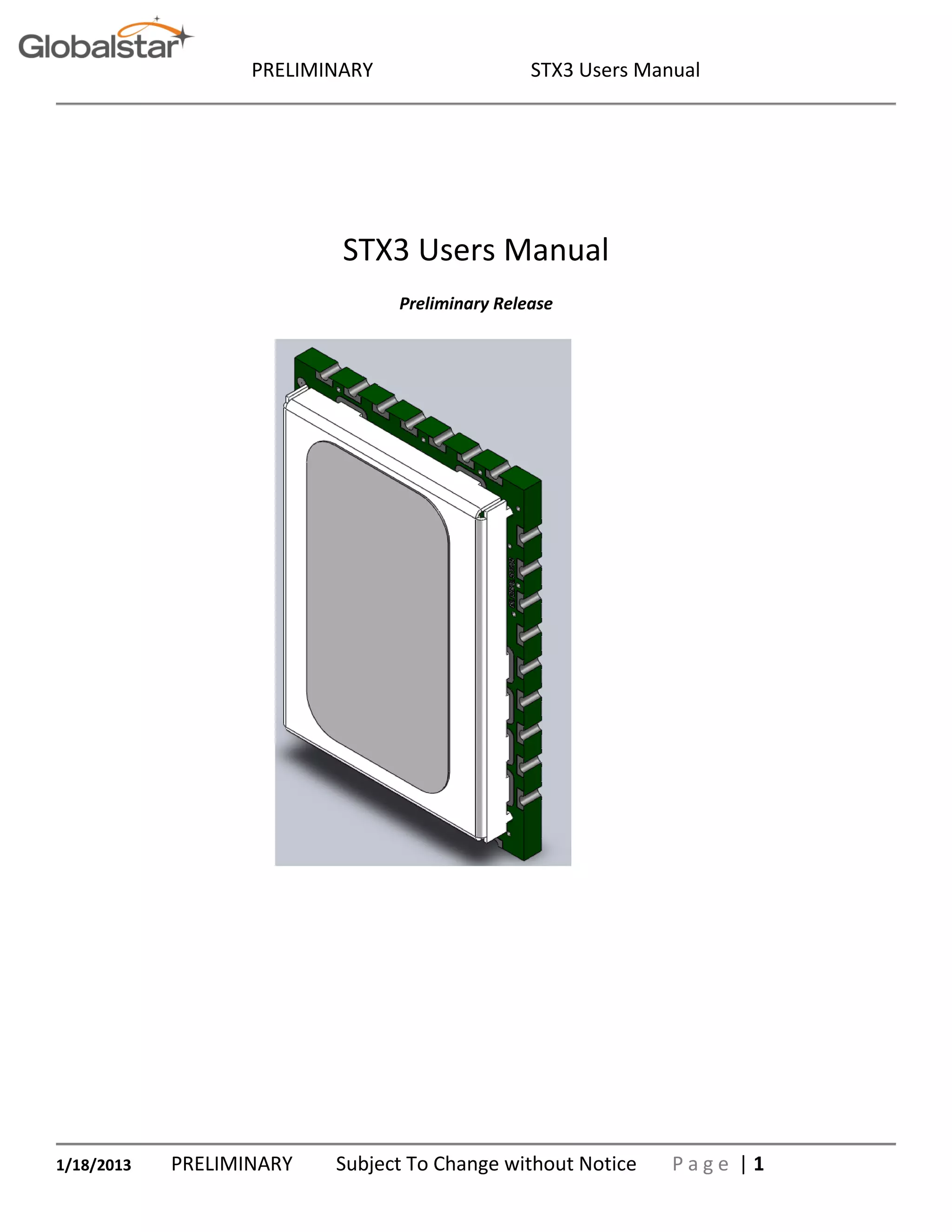 The STX3 Users Manual provides detailed technical specifications and operational guidelines for the STX3 satellite transmitter module, designed for transmitting user-defined data to the Globalstar satellite network. It describes the module's physical characteristics, application programming interface, operation theory, and implementation details, including serial packet formats and command structures. This manual serves as a resource for engineers and technical management familiar with basic engineering practices.