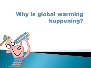 This document discusses global warming and climate change. It defines global warming as an increase in average surface temperatures from greenhouse gases like carbon dioxide. It explains how the greenhouse effect traps heat like in a car. While global warming refers to increased temperatures, climate change encompasses broader changes to things like precipitation patterns. Some effects of global warming are higher temperatures, habitat damage, and rising sea levels. The document lists actions individuals can take to reduce their carbon footprint and help address the problem.