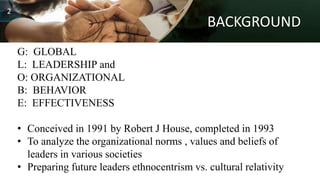 The GLOBE project, initiated by Robert J. House in 1991, investigates the impact of cultural differences on leadership across 825 organizations in over 60 countries, identifying nine cultural dimensions such as power distance, uncertainty avoidance, and gender egalitarianism. It emphasizes the importance of effective international communication and collaboration for management, while distinguishing cultural practices from values. The upcoming GLOBE 2020 aims to further explore cultural change and its influence on leadership and organizational practices.
