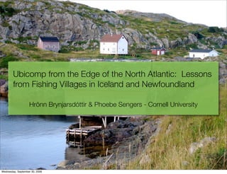 The document summarizes a study comparing two fishing villages - Change Islands in Newfoundland and Grindavík in Iceland. The study examined how ubiquitous technologies could support and preserve local cultures in these communities. Key lessons included obtaining informed consent from participants, preserving local cultures through technology, and translating embodied skills of fishing into digital formats. The researchers learned their agendas and assumptions impacted the work, and political issues within the communities also influenced outcomes. The goal was to understand how technologies could enhance fishing lifestyles in a thoughtful way.