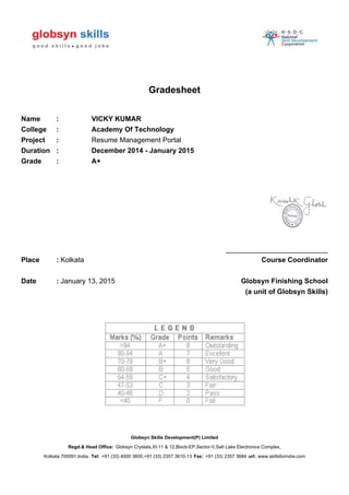 Vicky Kumar received an A+ grade for her project on developing a Resume Management Portal from December 2014 to January 2015 while studying at the Academy of Technology in Kolkata, India. The gradesheet was issued on January 13, 2015 by the Course Coordinator at Globsyn Finishing School, a unit of Globsyn Skills located in Kolkata.