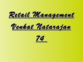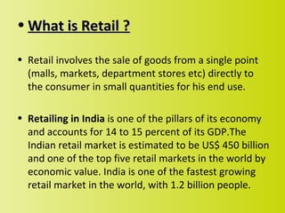 The document provides information about retail management and the retail store Globus. It discusses that retail involves the sale of goods directly to consumers. It then describes Globus, including its founding in 1998, expansion plans, store locations, design, pricing, brands offered, and promotions. The document also discusses Globus' employee structure, salary structure, dedication to employee development, achieving targets, response to the recession, and addressing employee complaints. Overall, the document offers an overview of retail management and provides details about the operations of the retail store Globus.