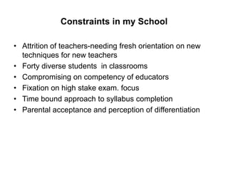 The document discusses formative assessment practices and challenges at Sishya School in Hosur. It notes the use of formative assessments as prescribed by CBSE, reduced continuous testing, avoiding revision tests, and individualized education programs for challenged students. It also mentions differentiated instruction in some units. However, it outlines constraints like teacher attrition requiring new orientations, large class sizes of 40 diverse students, focus on competency and exams, time-bound syllabus completion, and parental acceptance of differentiation.