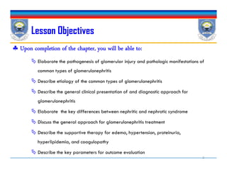 The document discusses glomerulonephritis, which refers to diseases of the glomeruli in the kidneys mediated by immune mechanisms. It can present as either a nephritic or nephrotic syndrome. Nephritic syndrome is characterized by hematuria, hypertension, and variable proteinuria, while nephrotic syndrome presents with massive proteinuria (>3.5 g/day), edema, hyperlipidemia, and sometimes a hypercoagulable state. The pathogenesis involves immune complex deposition or T-cell mediated responses targeting antigens in the glomerular basement membrane or mesangium. Treatment aims to control symptoms and slow disease progression using immunosuppressants or ACE inhibitors depending on the specific type