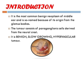 A Presentation on the various Glomus tumors of the ear and their treatment Modalities.