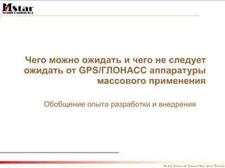 Документ обсуждает перспективы и ограничения технологий GPS и ГЛОНАСС для массового применения, отмечая высокий спрос на качественную навигацию, однако существующие решения не удовлетворяют ожидания пользователей. В нем подчеркивается необходимость в значительных инвестициях и эффективной стратегии разработки для создания конкурентоспособных чипсетов. Также рассматриваются нюансы маркетинга и ценообразования для выхода на массовый рынок.