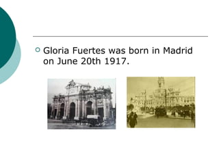 Gloria Fuertes was a Spanish poet born in 1917 in Madrid. She came from a poor family, with her father working as a doorman and her mother a seamstress. After her mother passed away in 1934, Fuertes had to work in a factory while continuing to write poetry. She went on to study literature and start a children's magazine. Fuertes received several honors for her writing and spent two years in the United States on a grant before becoming popular reciting her poems on television in the 1970s. She was known as the Poet of Children and passed away in 1998 in Madrid at the age of 81.