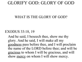 The document discusses the concept of glorifying God, referencing various biblical passages that highlight God's glory, mercy, and presence. It emphasizes how Jesus embodied and proclaimed God's glory through his actions and miracles, calling on Christians to reflect this glory in their daily lives by helping the oppressed and living righteously. The text also encourages the understanding that both physical and spiritual aspects of life should be dedicated to glorifying God.