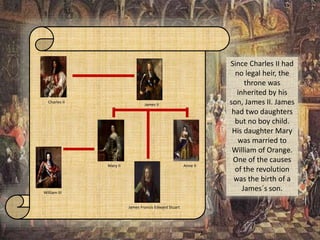 The Glorious Revolution occurred in England in 1688. James II became king after Charles II died without an heir, but he faced opposition for being Catholic and trying to assert absolute power. William of Orange invaded England with an army, with James fleeing. William and Mary then agreed to become joint monarchs on the condition that they pass the Bill of Rights, which limited royal power and strengthened Parliament.