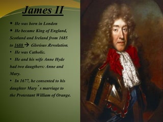 The Glorious Revolution took place in England in 1688. Key figures included King James II, who was Catholic and wanted to promote Catholics, William III and Mary II, James II's Protestant daughter who he married to William of Orange. Due to James II promoting Catholics and the birth of a son who could succeed him, threatening England's Protestant religion, William of Orange invaded with support from nobles. James II fled to France. In his place, Parliament invited William and Mary to become the new monarchs, establishing a constitutional monarchy through the Bill of Rights.