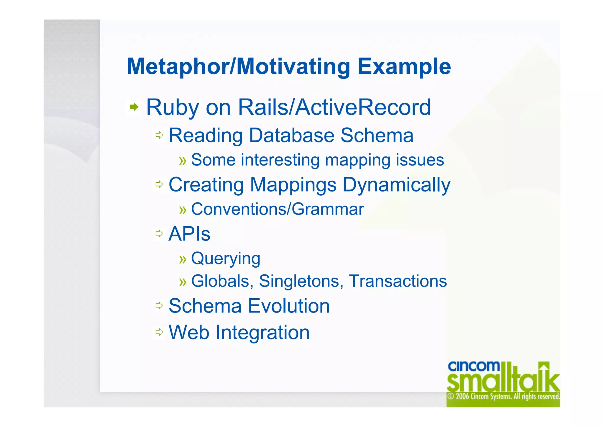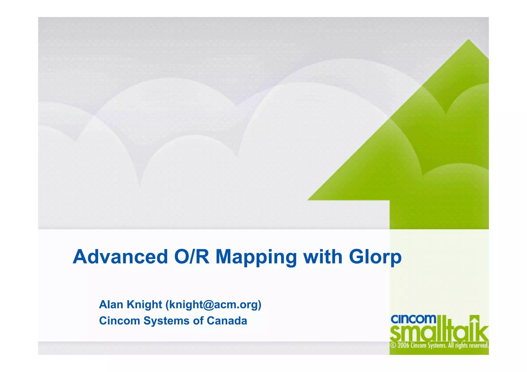 This document discusses Glorp, an object-relational mapping framework for Smalltalk, and compares it to ActiveRecord in Ruby on Rails. It summarizes Glorp's approach to reading a database schema, generating mappings dynamically based on conventions and constraints, and integrating with web frameworks like Magritte. The document also discusses issues like subselects, aggregations, and correlated subqueries that Glorp addresses to provide ActiveRecord-like functionality while maintaining flexibility.