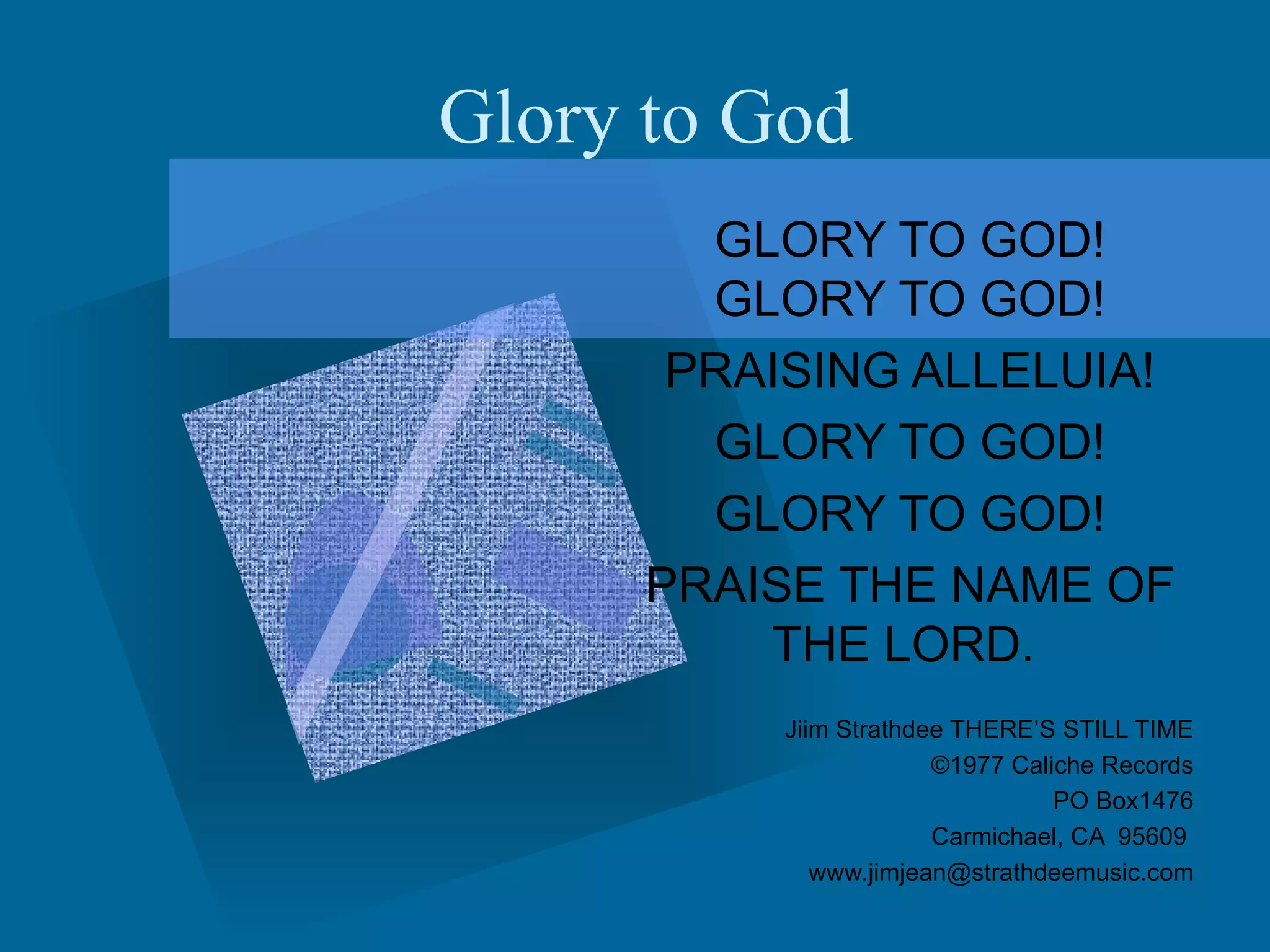 ![Glory to God GLORY TO GOD! GLORY TO GOD! PRAISING ALLELUIA! GLORY TO GOD! GLORY TO GOD! PRAISE THE NAME OF THE LORD. Jiim Strathdee THERE’S STILL TIME ©1977 Caliche Records PO Box1476 Carmichael, CA 95609 [email_address]](https://image.slidesharecdn.com/glorytogodstrdee-110502182806-phpapp02/75/Glory-to-god-strdee-1-2048.jpg)