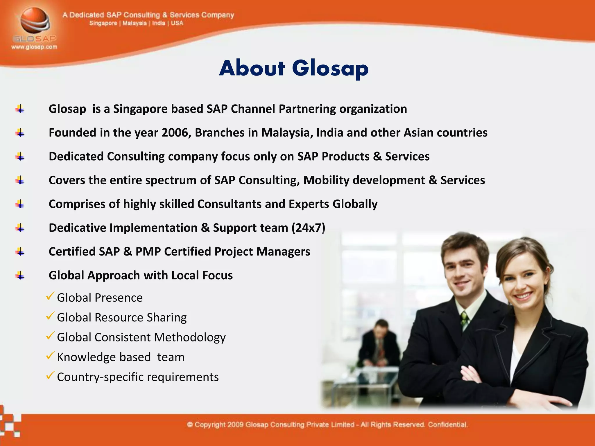 Glosap is a Singapore-based SAP consulting firm with branches in Malaysia and India. It focuses exclusively on SAP products and services, covering consulting, mobility development, and support. Glosap aims to act as an extension for SME customers to successfully implement IT transformations using a global approach with local focus.