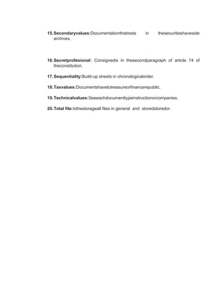 This document defines various terms related to document management and archiving, including administrative age, document retention table, file, folderama, home production, legajo, life cycle of a document, metal shelves, middle age, mobile files, reprography, secondary values, secret professional, sequentiality, tax values, technical values, and total file. It provides descriptions of the purpose or use of each term as it relates to organizing, storing, and retaining documents and records over time.