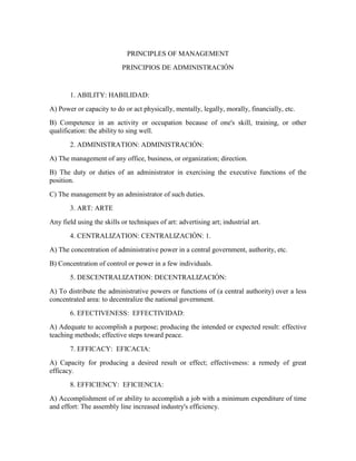 This document is a glossary containing definitions of 25 terms related to management principles in both English and Spanish. The terms defined include ability, administration, art, centralization, decentralization, effectiveness, efficacy, efficiency, economy, hierarchy, influence, management, mission, organization, planning, process, production, research, resources, results, science, structure, target, technique, and theory. References used to construct the definitions are also listed.