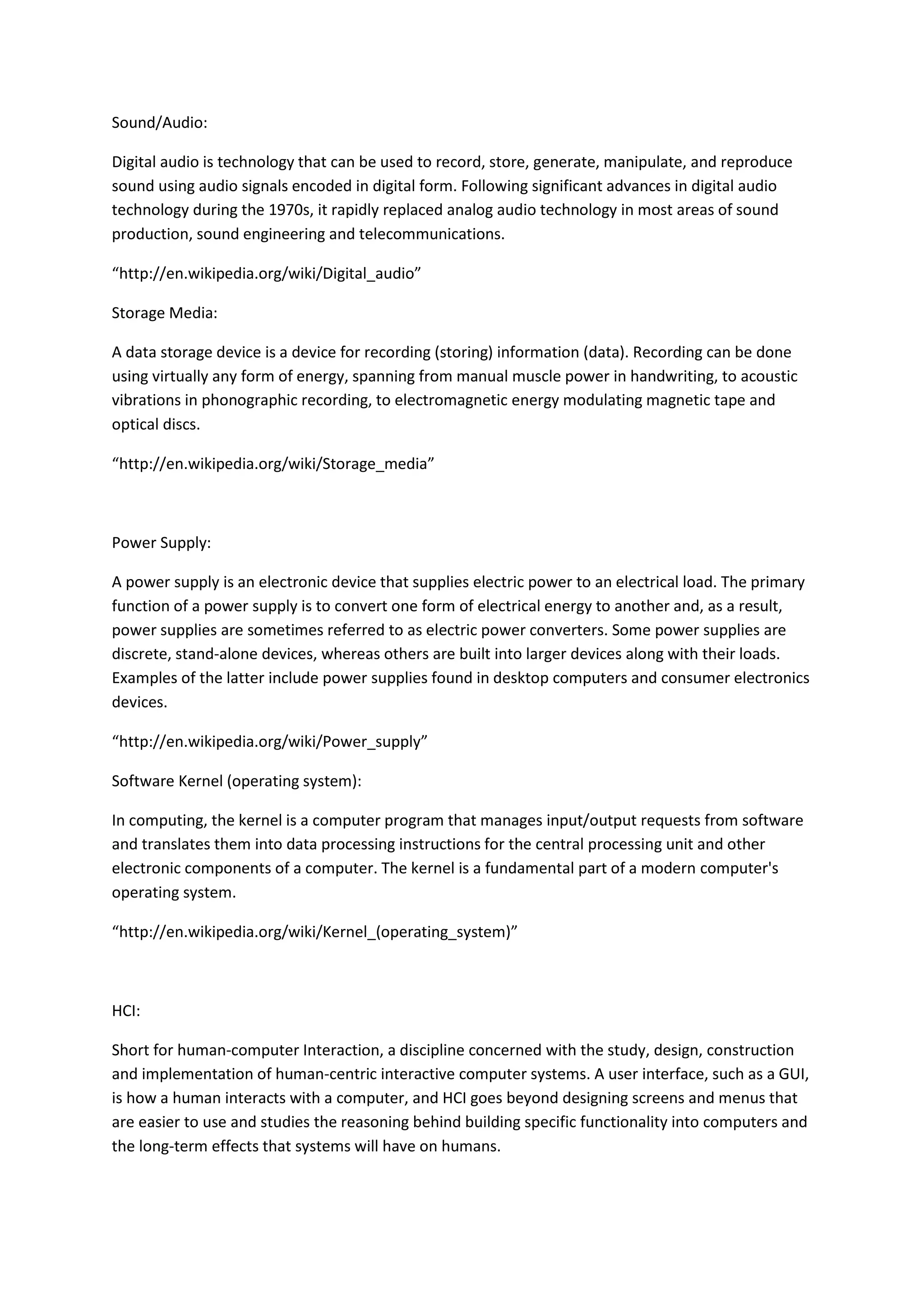 RAM allows data to be read and written in roughly the same amount of time regardless of the order accessed, unlike storage media like hard disks that are slower to access data in some locations. A CPU carries out computer program instructions by performing basic arithmetic, logical and input/output operations. A GPU is specialized for rapidly manipulating memory to generate graphics and is more efficient than CPUs for parallel processing of large data blocks. Common display technologies include LCD, CRT and plasma which present video output across a full rectangular area.