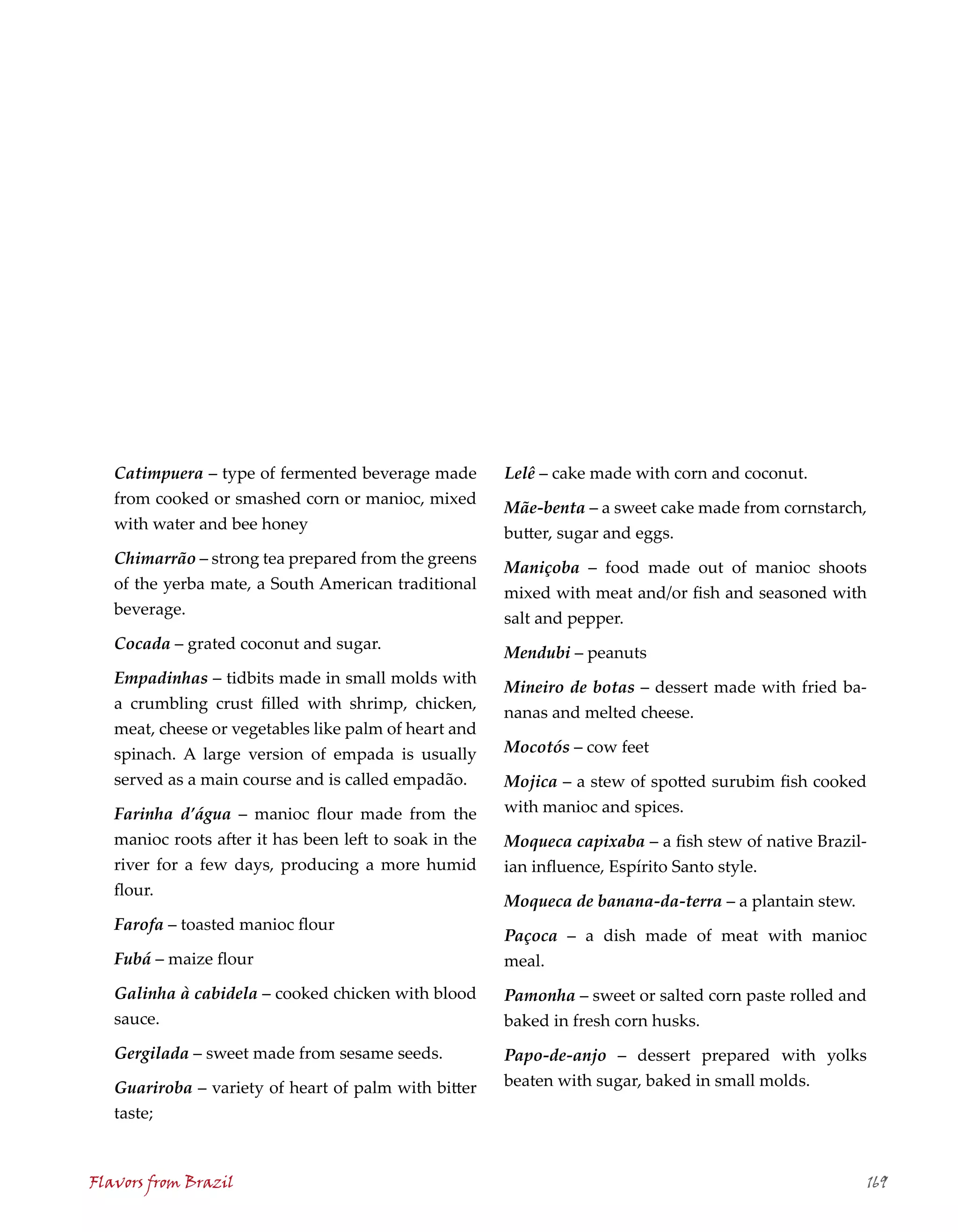 This document provides definitions for over 70 traditional Brazilian foods, dishes, and ingredients. It includes staples like rice, beans, and manioc flour as well as regional specialties featuring ingredients like pequi, acai, and dried shrimp. Dishes range from simple sides and snacks to complex stews incorporating meats, seafood, and indigenous or African influences. The glossary offers insight into the rich culinary traditions and influences that have shaped Brazilian cuisine.