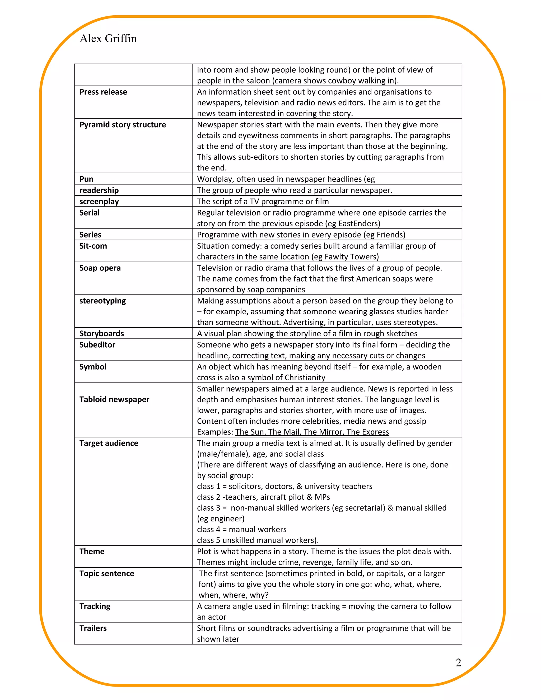 This glossary defines various media terms that may be useful for Alex's exam and portfolio revision, including: