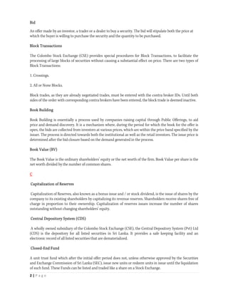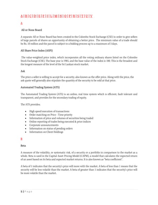 The document provides definitions for various terms related to the stock market and investing. It defines terms like the All Share Price Index, Ask price, Automated Trading System, Beta, Bid price, Block Transactions, Book Building, Book Value, Capitalization of Reserves, Central Depository System, Closing Price, Colombo Stock Exchange, Companies Act, Compliance Officer, Convertible Debenture, Corporate Bond, Crossings, Debentures, Debt Securities Trading System, Dematerialization, Demutualization, Derivatives, Diversification, Dividend Per Share, Dividend Yield, Dividends, Earnings Per Share, Entity, Equity, and Ex-Capitalization Period
