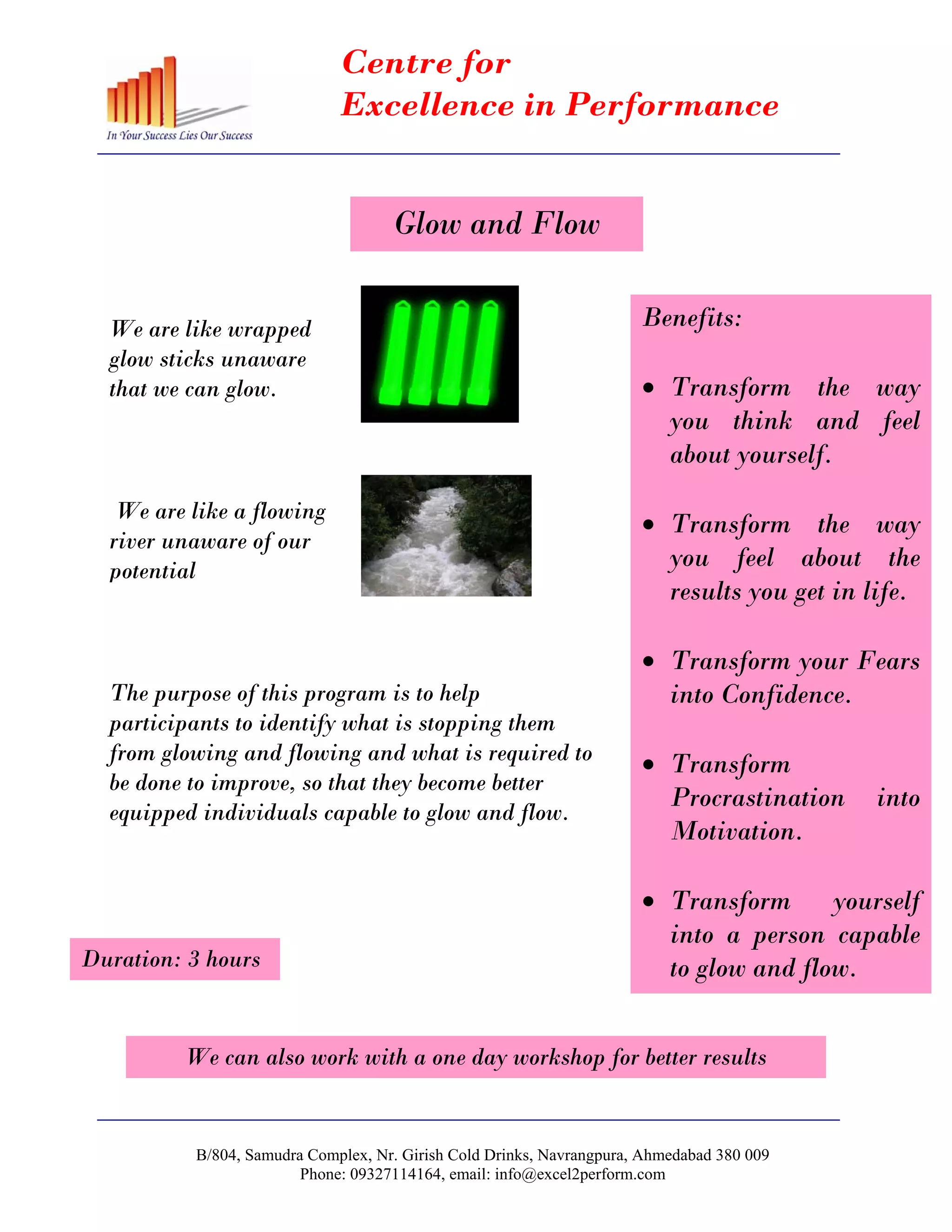 The document outlines a program offered by the Centre for Excellence in Performance aimed at helping participants identify and overcome barriers to realizing their full potential. It focuses on transforming self-perception, fears, and procrastination into confidence and motivation. The program lasts for 3 hours and can also be extended to a one-day workshop for improved outcomes.