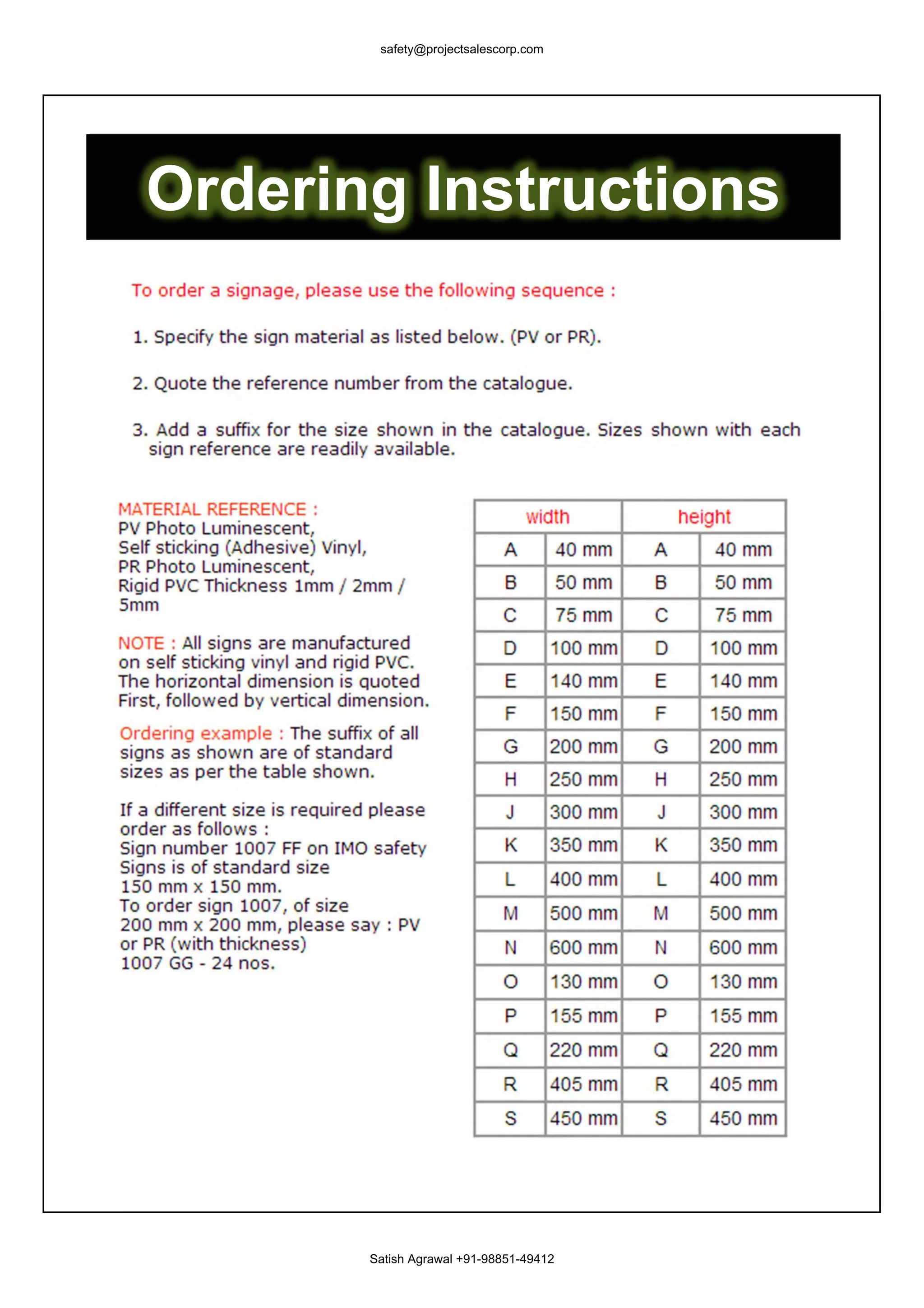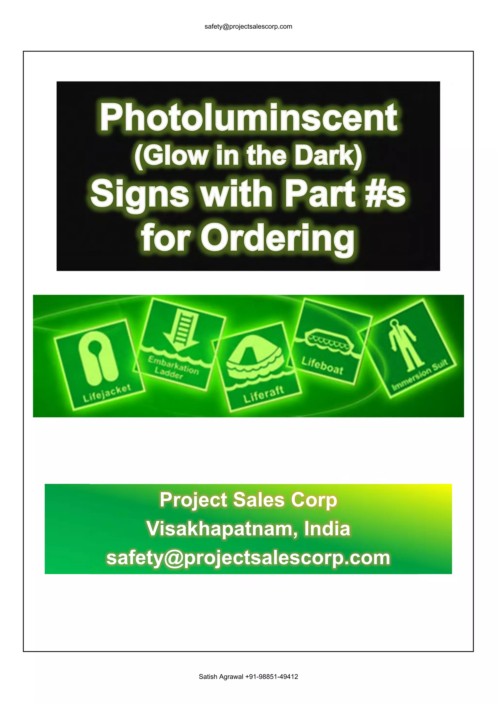 The document contains contact information for Project Sales Corp in Visakhapatnam, India and Satish Agrawal, including an email address for safety-related inquiries. It also lists several topics relating to safety symbols, signs, and marker dots/tapes that appear to be covered in the following pages. The document seems to be instructional or informational in nature regarding safety icons and guidance.