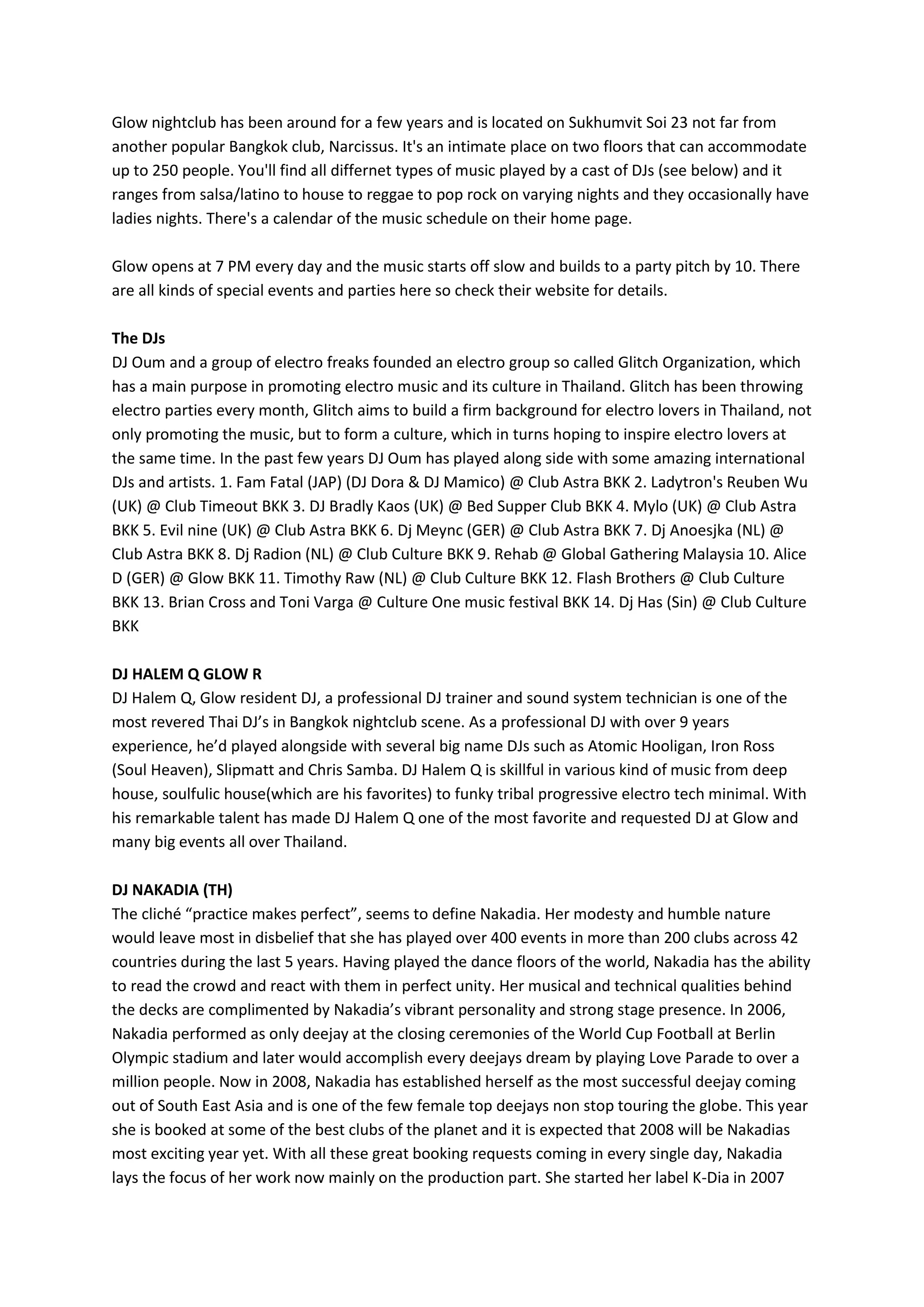 Glow nightclub is located in Bangkok and has been open for several years. It is an intimate two-floor venue that can host up to 250 people. The club plays a variety of music genres on different nights, ranging from salsa to house to reggae to pop rock. DJs at the club include DJ Oum, who has played with international artists, and resident DJ Halem Q, who is skilled in genres like deep house and soulful house. The club also features female Thai DJ Nakadia, who has played over 400 gigs in 42 countries in the last 5 years.