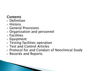GLP provides a quality system for non-clinical laboratory studies to ensure reliability of results. It aims to develop quality test data and avoid duplication through adherence to standards for organization, personnel, facilities, equipment, operation of studies and reporting. GLP was created by the FDA in 1978 and adopted internationally by organizations like OECD to facilitate acceptance of study data across regions.