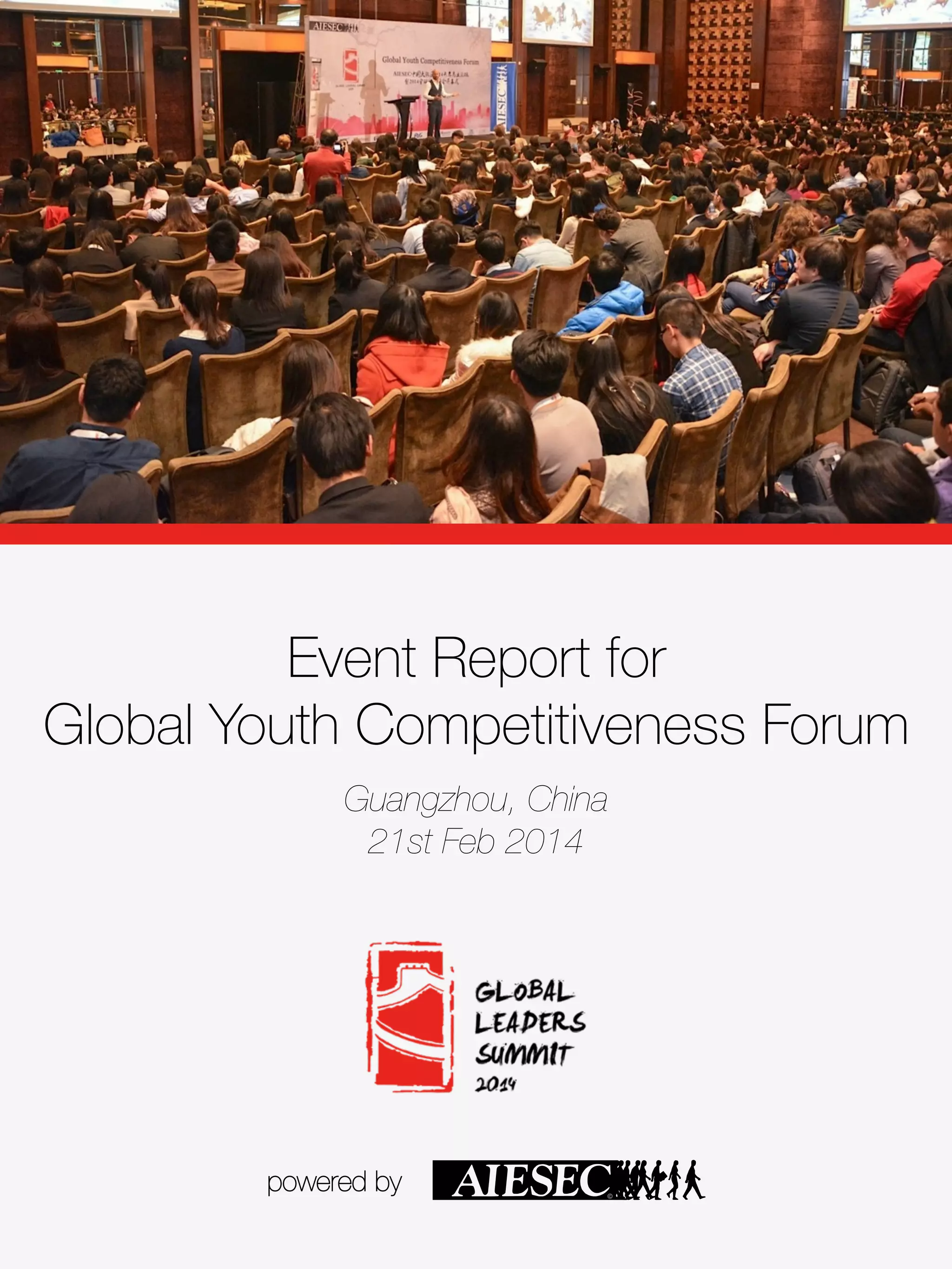 The document summarizes the Global Youth Competitiveness Forum event hosted by AIESEC in Guangzhou, China. Over 210 young leaders from 124 countries gathered to discuss strategies for empowering the new generation of globally competitive leaders. The event included presentations from corporate leaders, a panel discussion, and workshops. Key topics discussed were the skills and attributes needed for young people to succeed in today's global job market.