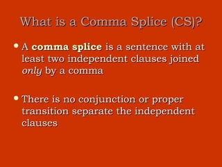 The document discusses common types of sentence errors: comma splices, run-on sentences, and sentence fragments. It defines each type of error and provides examples. It then describes six ways to fix comma splices and run-on sentences, which involve using transitional expressions, conjunctions, semicolons, separating clauses into sentences, changing clauses, and transforming clauses. It also defines and provides examples of sentence fragments like dependent clause fragments and how to fix them.