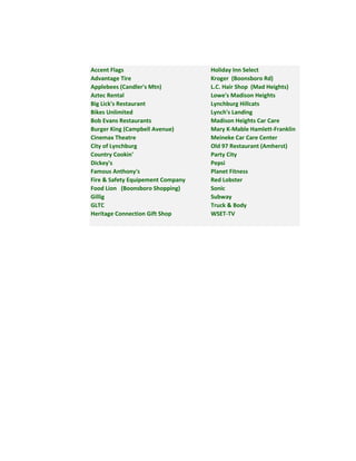 This document contains a list of over 30 business names located in and around Lynchburg, Virginia. The businesses span a wide range of industries including restaurants, retail stores, automotive services, entertainment venues, and more. Most of the businesses listed seem to be local franchises or independently owned locations rather than large national chains.