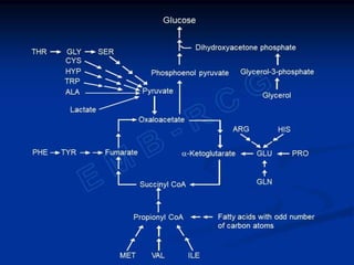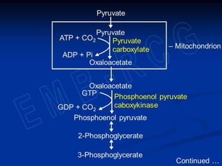 Gluconeogenesis is the synthesis of glucose from non-carbohydrate substrates like lactate, glycerol and certain amino acids. It occurs in the liver and kidneys when carbohydrate availability is low, such as during fasting or diabetes. While fatty acids can provide energy, glucose is still required by certain tissues and as a precursor for lactose production. Gluconeogenesis bypasses the irreversible steps of glycolysis using different enzymes and pathways that convert substrates like pyruvate and the Cori cycle transfers lactate from muscles to the liver for glucose synthesis. Gluconeogenesis is regulated both long-term through induction of enzymes by glucocorticoids and repression by insulin, and short-term through the
