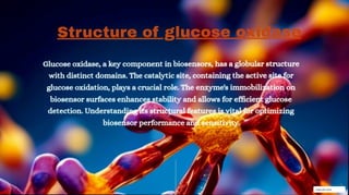 Glucose oxidase is a key enzyme used in biosensors. It has a globular structure with distinct domains that allow it to efficiently catalyze the oxidation of glucose. Its high specificity and stability upon immobilization make it suitable for accurate glucose detection applications. However, glucose oxidase biosensors are sensitive to oxygen levels and susceptible to interference, presenting challenges that researchers continue working to address through miniaturization, sensitivity enhancements, and integration with digital technologies.