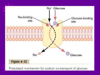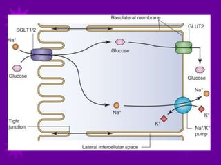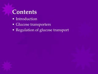 Glucose transport into cells is mediated by glucose transporter (GLUT) proteins. [1] There are five main GLUT transporters that are involved in glucose transport and each has a distinct tissue distribution and function. [2] GLUT transporters use a flip-flop mechanism to transport glucose across the cell membrane according to the concentration gradient. [3] Insulin regulates glucose transport by stimulating the translocation of GLUT4 and GLUT1 transporters from intracellular vesicles to the cell membrane, increasing the influx of glucose into cells.