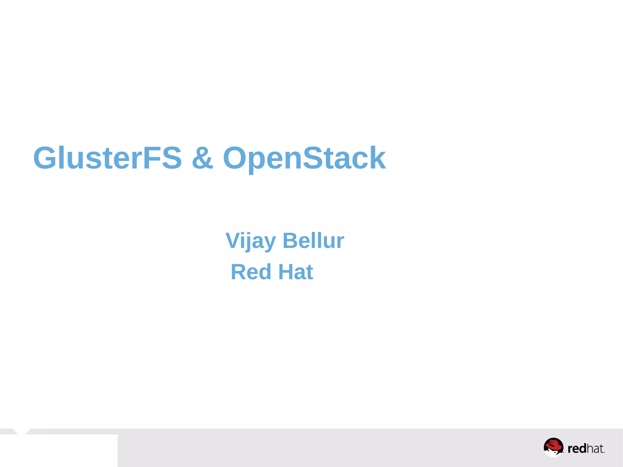 GlusterFS is an open-source networked file system that provides scalable, distributed storage for OpenStack. It aggregates disk storage from multiple servers into a single global namespace that is accessible from anywhere. GlusterFS uses a distributed hashing technique to spread files across servers and can be configured for replication or erasure coding for redundancy. It integrates with OpenStack components like Swift, Cinder, and Glance to provide block, object, and file-level storage services for virtual machines. Future integration plans include a Cinder-like file service (FaaS) and support for Windows and NFS shares.