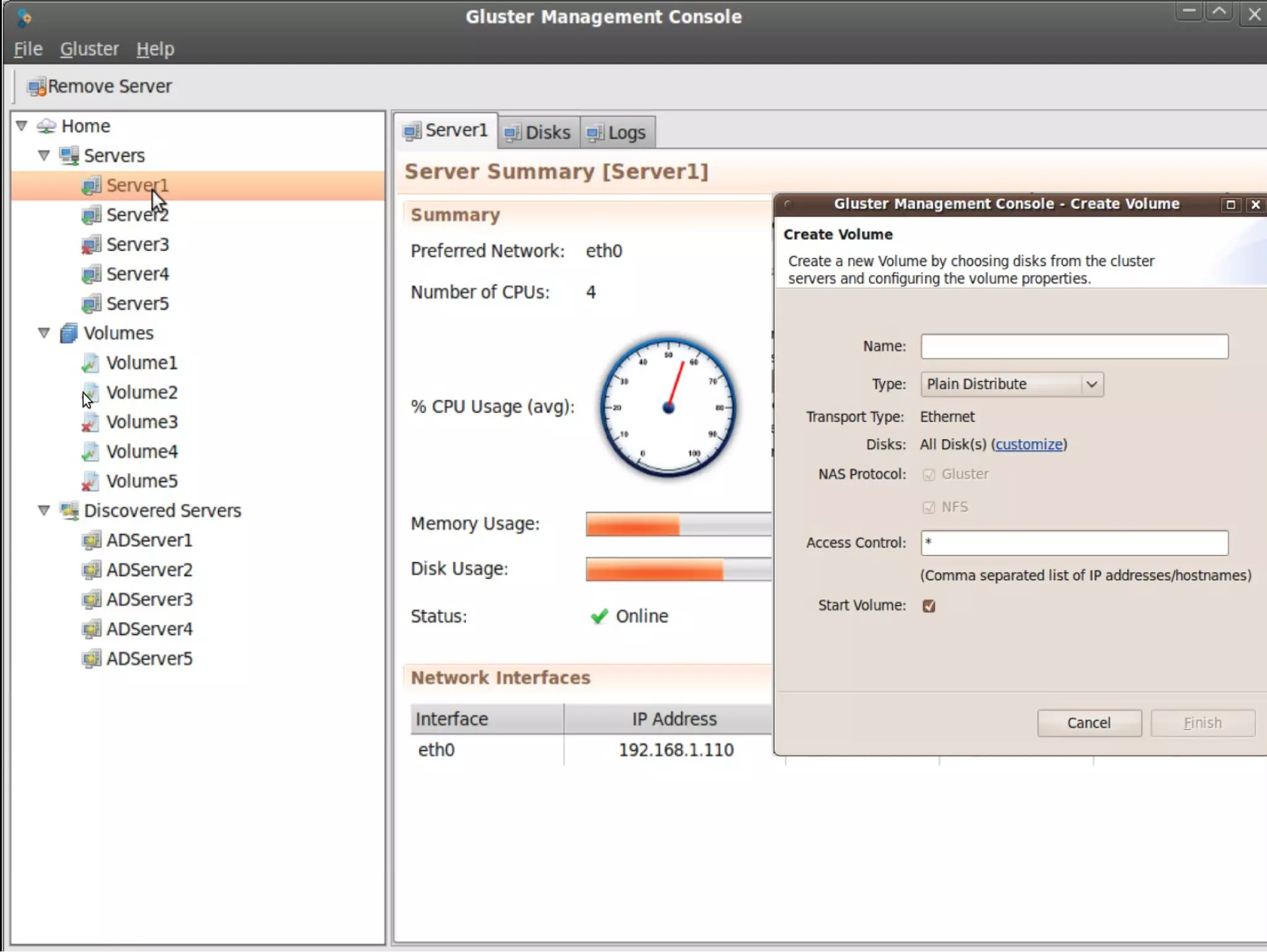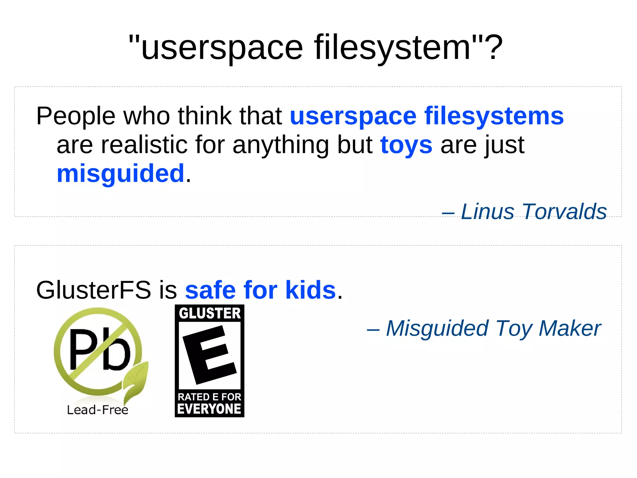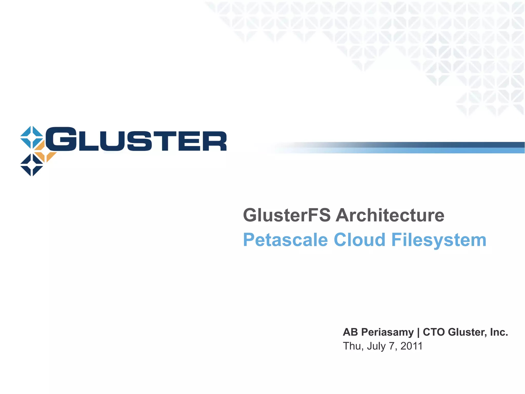 The document discusses GlusterFS, an open source distributed file system. It provides details about GlusterFS architecture, which uses a userspace filesystem design running on top of FUSE. It also summarizes GlusterFS capabilities like elastic scaling, high availability through replication, and support for various volume types including distribute, replicate, and stripe. Benchmark results show GlusterFS achieving high performance with 64 servers and 220 clients connected over InfiniBand.