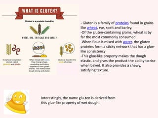This document discusses gluten free pasta. It begins by explaining what gluten is and how it provides elasticity and texture to traditional wheat pasta. It then discusses celiac disease and the need for gluten free options. It describes the basic production process for pasta and highlights the key differences for gluten free pasta, which lacks the gluten network. Specific challenges of making pasta from rice and corn are outlined. Solutions discussed include extrusion cooking of rice flour, adding pre-gelatinized starch or flour, and using additives like poly-C-one to improve texture. The microstructures of wheat and gluten free pastas are also compared.