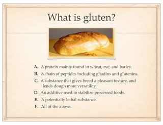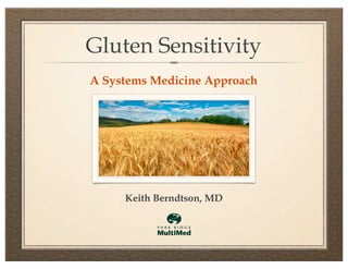 The document discusses gluten sensitivity, its related medical conditions (wheat allergy, celiac disease, non-celiac gluten sensitivity), and the complexity involved in diagnosing and treating these conditions. It emphasizes the importance of a systems medicine approach for patients with unexplained symptoms possibly related to gluten, as conventional celiac panels may not provide sufficient information. Additionally, the document highlights the need for awareness of dietary management and potential health risks associated with gluten exposure.