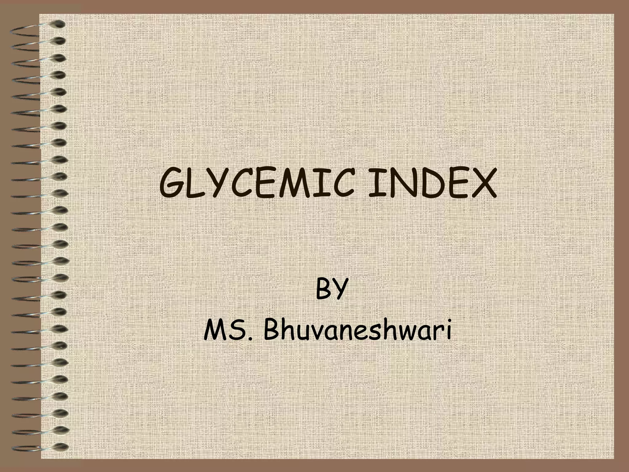 The document discusses glycemic index (GI), a method of classifying foods based on their effect on blood glucose levels. Foods that breakdown quickly during digestion have a high GI, while foods that breakdown slowly, releasing glucose gradually, have a low GI. To determine a food's GI rating, its effect on blood glucose levels over 2 hours is measured in healthy individuals and compared to a standard food. Common foods and their GI values are provided, and factors like fiber, fat, and cooking methods that affect a food's GI are explained. Tips to lower the overall GI of daily meals include choosing whole grains, fruits and vegetables, and combining high and low GI foods.