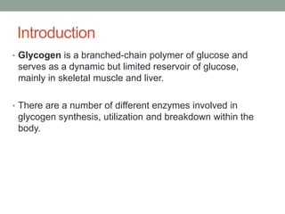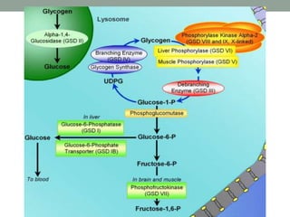 Glycogen storage disorders are a group of inherited metabolic disorders caused by deficiencies in enzymes involved in glycogen synthesis or breakdown. There are several types classified by the affected enzyme and tissue. Type I, Von Gierke's disease, is caused by glucose-6-phosphatase deficiency affecting the liver and kidneys, leading to organ enlargement, high lactate levels, and gout. Type II, Pompe's disease, results from acid maltase deficiency impacting many tissues including heart, liver, and muscles. Symptoms range from cardiac failure in infants to late-onset muscle weakness. Treatment may include enzyme replacement therapy or diet modification.
