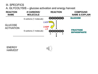 The document summarizes the overall pathways of glycolysis and the citric acid cycle/electron transport chain. Glycolysis occurs in the cytoplasm and involves glucose activation using 2 ATP and energy harvest from pyruvate production yielding 2 ATP and 2 NADH. The citric acid cycle and electron transport chain occur in the mitochondria, use oxygen, and produce 36 ATP and 2 carbon dioxide from the breakdown of 1 pyruvate, which is generated from glycolysis. Both pathways are exergonic overall.