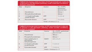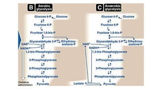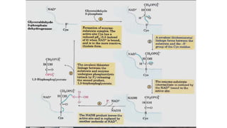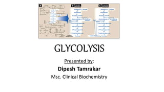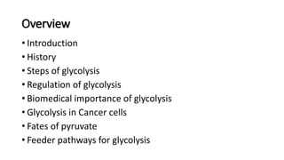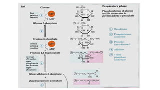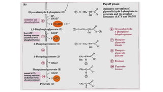 Glycolysis is the breakdown of glucose to pyruvate through a series of enzyme-catalyzed reactions. It occurs in the cytosol and consists of a preparatory phase requiring ATP and a payoff phase generating ATP. Key steps include phosphorylation by hexokinase, aldolase cleavage, substrate-level phosphorylation by phosphoglycerate kinase, and pyruvate formation by pyruvate kinase. Glycolytic enzymes are regulated by feedback inhibition and metabolites like fructose 2,6-bisphosphate and AMP/ATP ratios to control flux through the pathway.