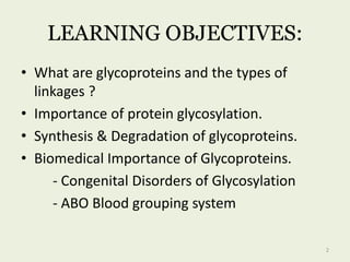 Glycoproteins are proteins that contain carbohydrate chains covalently attached. They can be O-linked, N-linked or GPI-anchored. Glycoproteins play important structural and functional roles like cell adhesion and acting as receptors. They are synthesized through a complex process in the endoplasmic reticulum and Golgi apparatus. Congenital disorders of glycosylation can occur from mutations affecting glycoprotein synthesis. Blood groups are also determined by glycoproteins on red blood cell surfaces.