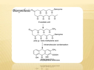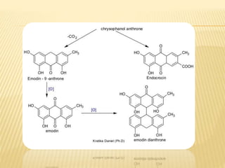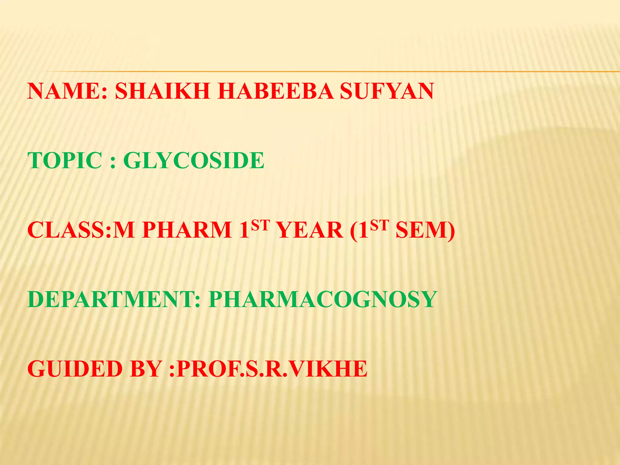 This document provides information about glycosides. It discusses various types of glycosides including glycyrrhizin from liquorice root, sennosides from senna leaves, bacosides from Bacopa monnieri leaves, and quercetin found in oak bark. Glycosides are composed of a sugar and aglycone. They play various roles in plants such as detoxification and storing compounds. The document describes the extraction and isolation methods for these specific glycosides and provides references for further information.